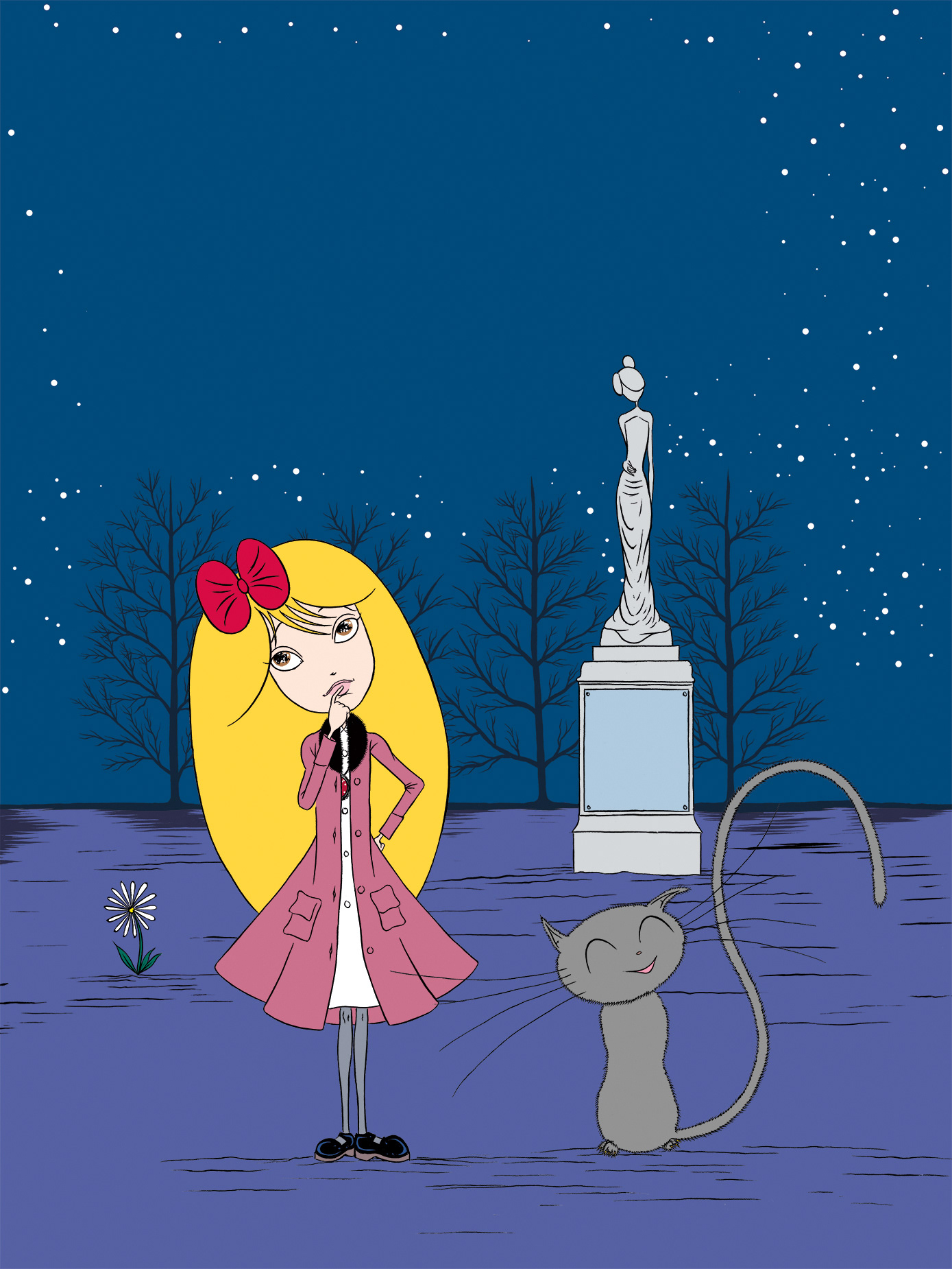 Original opening illustration for Nina's Phantom Friend. I replaced this illustration in the final book, because for me, the eventual image of Nina searching in the forest for her cat had more dramatic weight. It illustrated the concept of the seasons changing much more effectively, and the leaves blowing past her added mood and pathos to the scene.