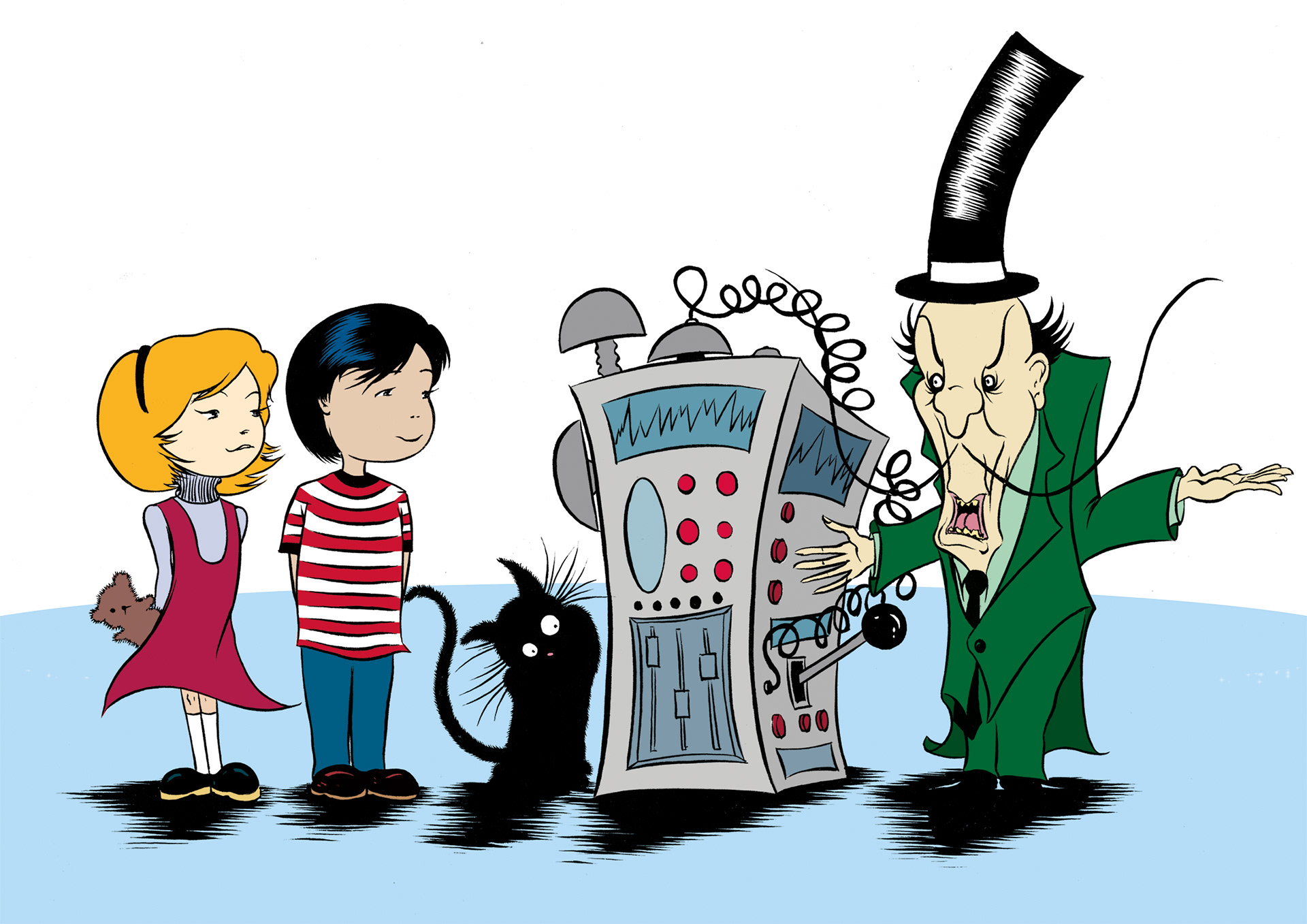 Concept art illustration for The Do It All Machine - Originally conceived 2006, about a machine that can mimic any activity in a virtual world, but loses to the messiness and fun of carrying out the activity in real life.